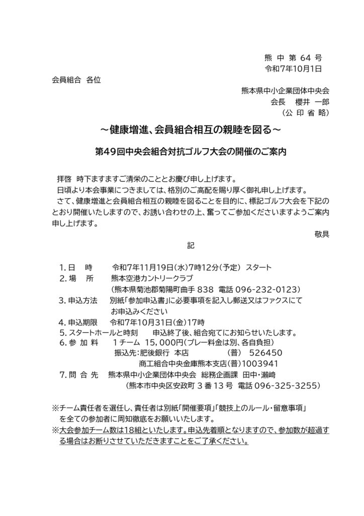 熊本県中央会では、健康増進と会員組合相互の親睦を図ることを目的に、 標記ゴルフ大会を下記のとおり開催いたしますので、 お誘い合わせの上、奮ってご参加くださいますようご案内申し上げます。 詳細及び申込方法等につきましては、別添資料をご確認いただきますようお願い申し上げます。