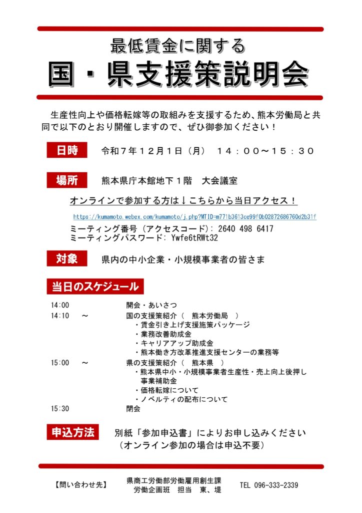 熊本県の改正最低賃金が令和8年1月1日から施行となることから、各事業者様の生産性向上や価格転嫁等の取組みを支援するため、熊本労働局と共同で標記説明会を開催されます。