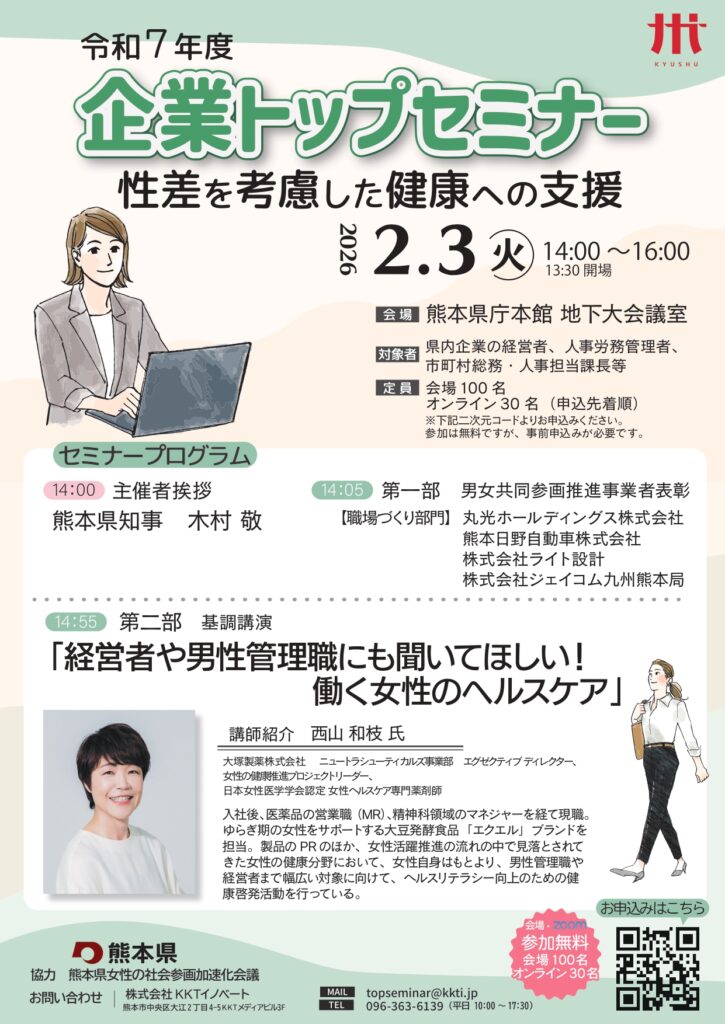 熊本県では、男女が働きやすい環境整備や企業の意思決定の場への女性の参画促進等の重要性を考える契機とするため、企業トップセミナーを開催します。